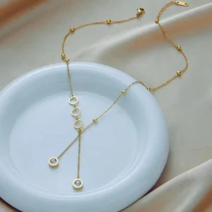W ofercie dostępne są łańcuszki, celebrytki, naszyjniki z zawieszką, kaskadowe „layering” oraz delikatne krawatki. Wybrane modele są pozłacane 14–18K lub wykończone srebrem 925 jako dekoracyjna powłoka – rdzeń produktu to zawsze stal 316L.