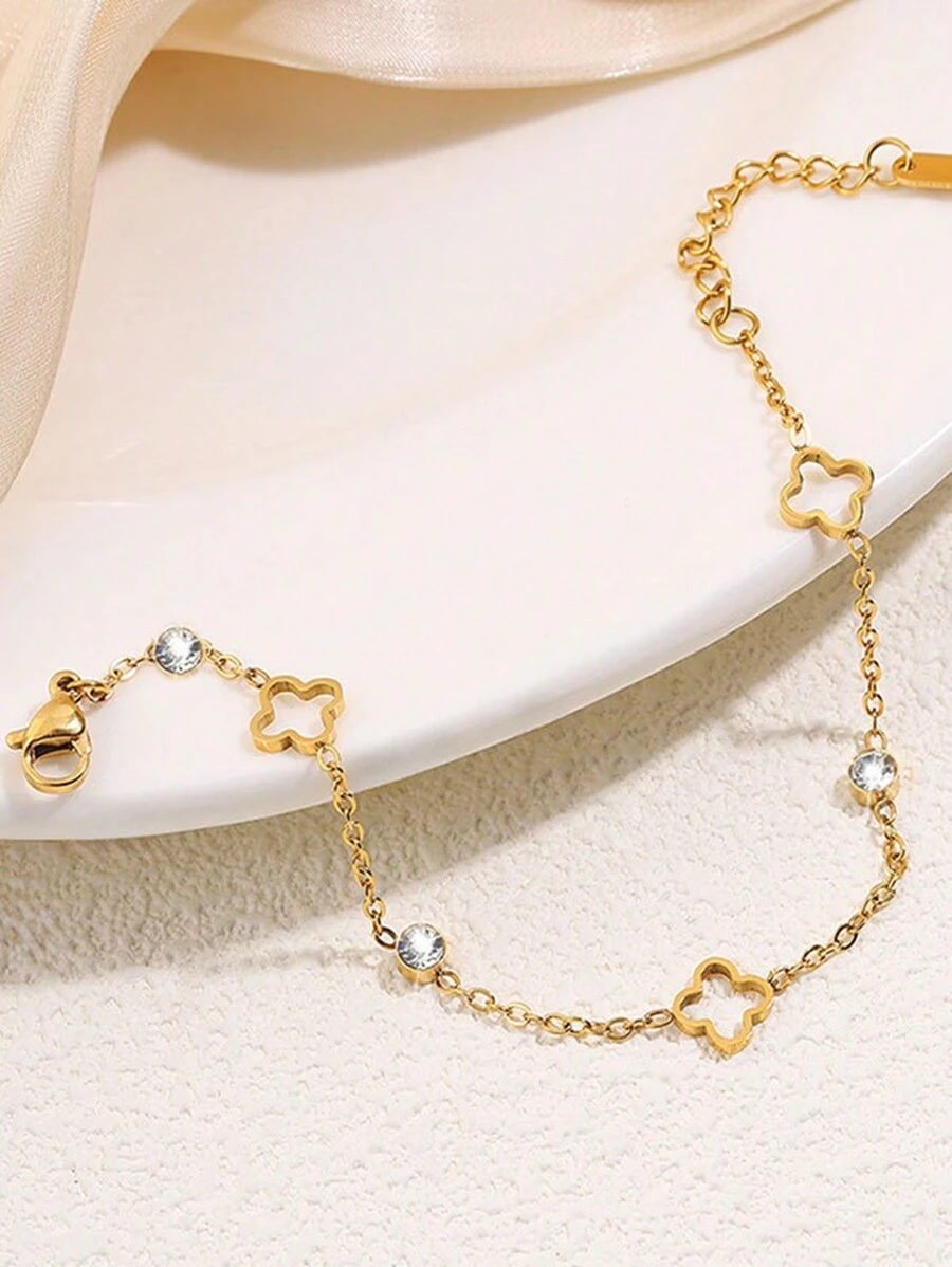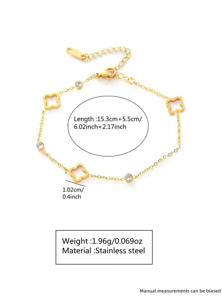 Delikatna bransoletka ze stali nierdzewnej w kolorze złotym, ozdobiona koniczynką i cyrkoniami. Regulowana długość 15.3-20.8cm. Idealna na co dzień i na prezent.