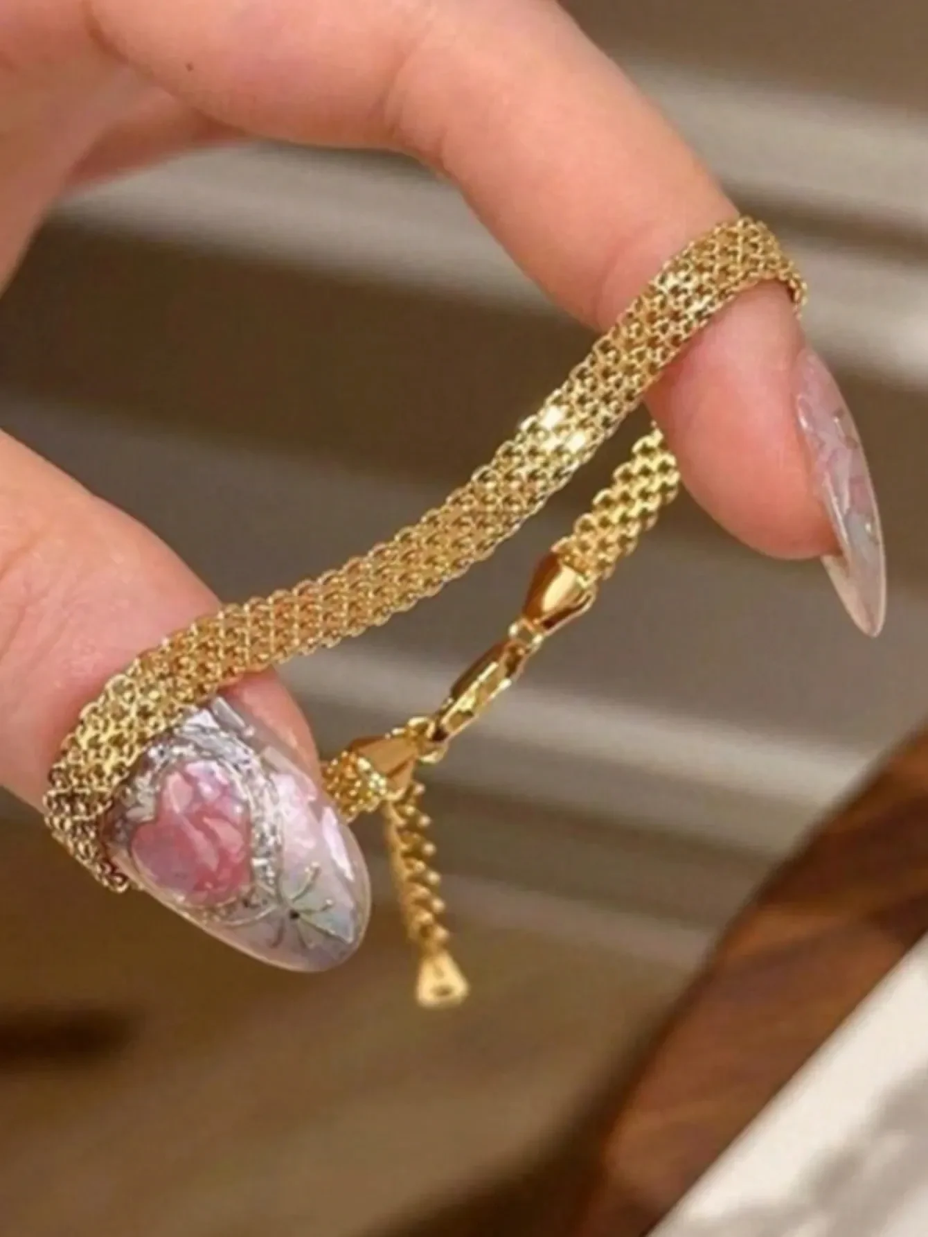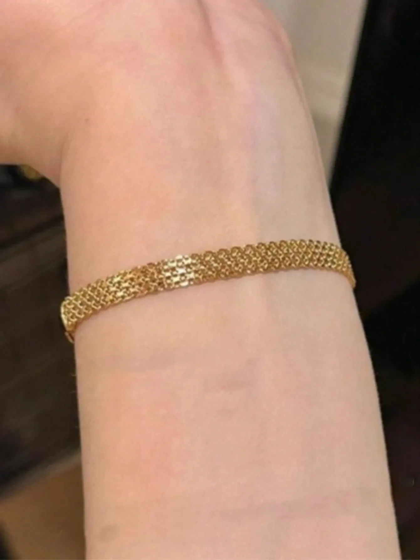 Ta elegancka bransoletka z gęstej plecionki mesh to połączenie ponadczasowej klasyki i nowoczesnego designu. Jej złoty kolor i delikatna, siateczkowa struktura pięknie odbijają światło, dodając każdej stylizacji luksusu i blasku.