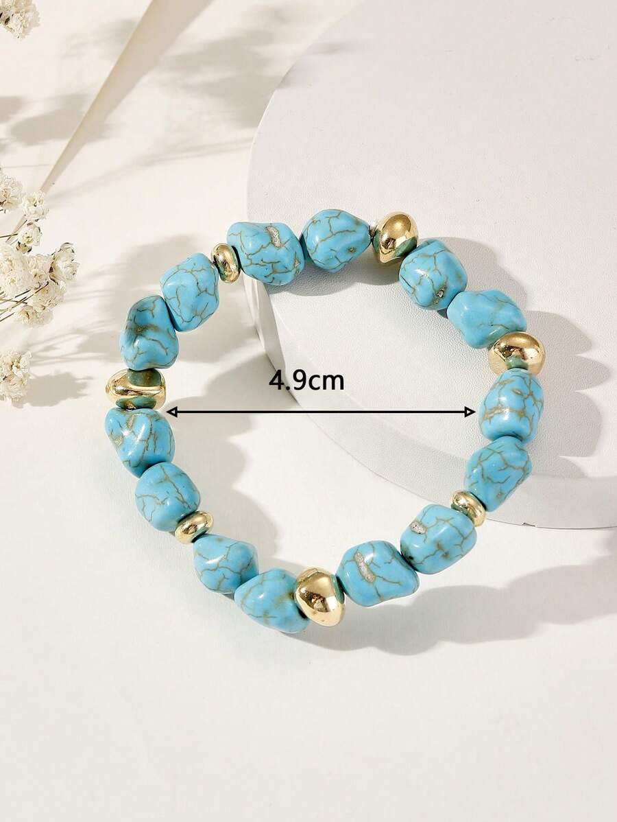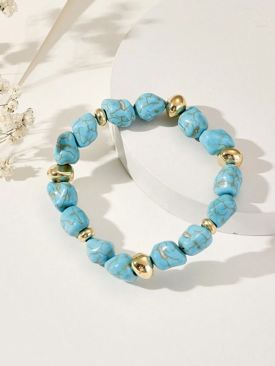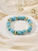 Ta wyjątkowa bransoletka na gumce z imitacją turkusów to idealny dodatek dla kobiet, które cenią sobie oryginalny design i wygodę noszenia. Jej piękny design z turkusowymi koralikami i złotymi dodatkami z pewnością doda każdej stylizacji odrobinę boho szyku i letniej świeżości.