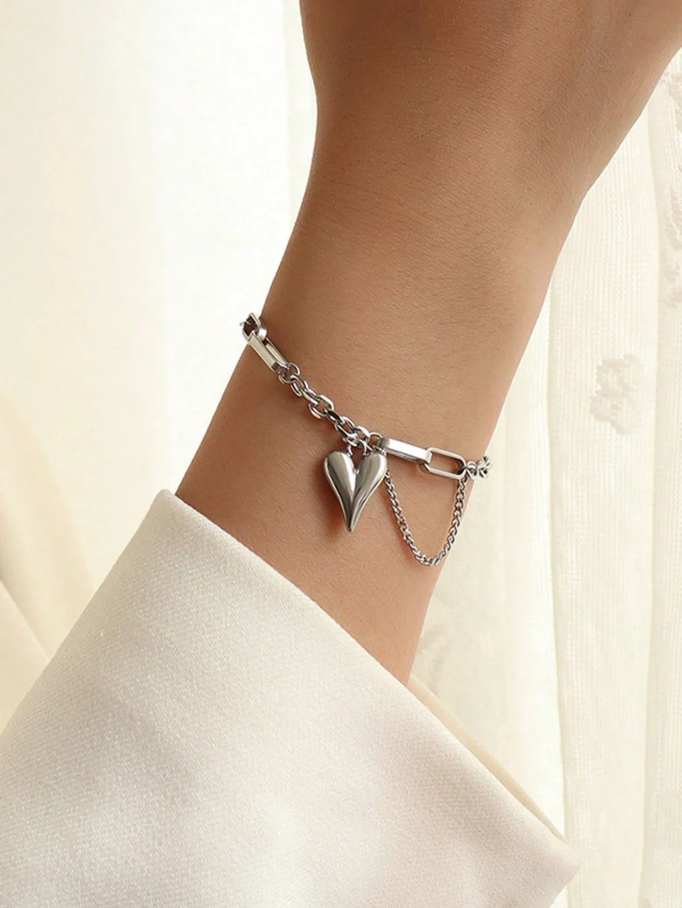 Ta elegancka bransoletka w kolorze Srebrnym z romantyczną zawieszką w kształcie serca to idealna biżuteria, która wyraża uczucia w subtelny i stylowy sposób. Wykonana z hipoalergicznej stali szlachetnej, zachwyca ciepłym odcieniem i trwałością, która przetrwa lata noszenia.