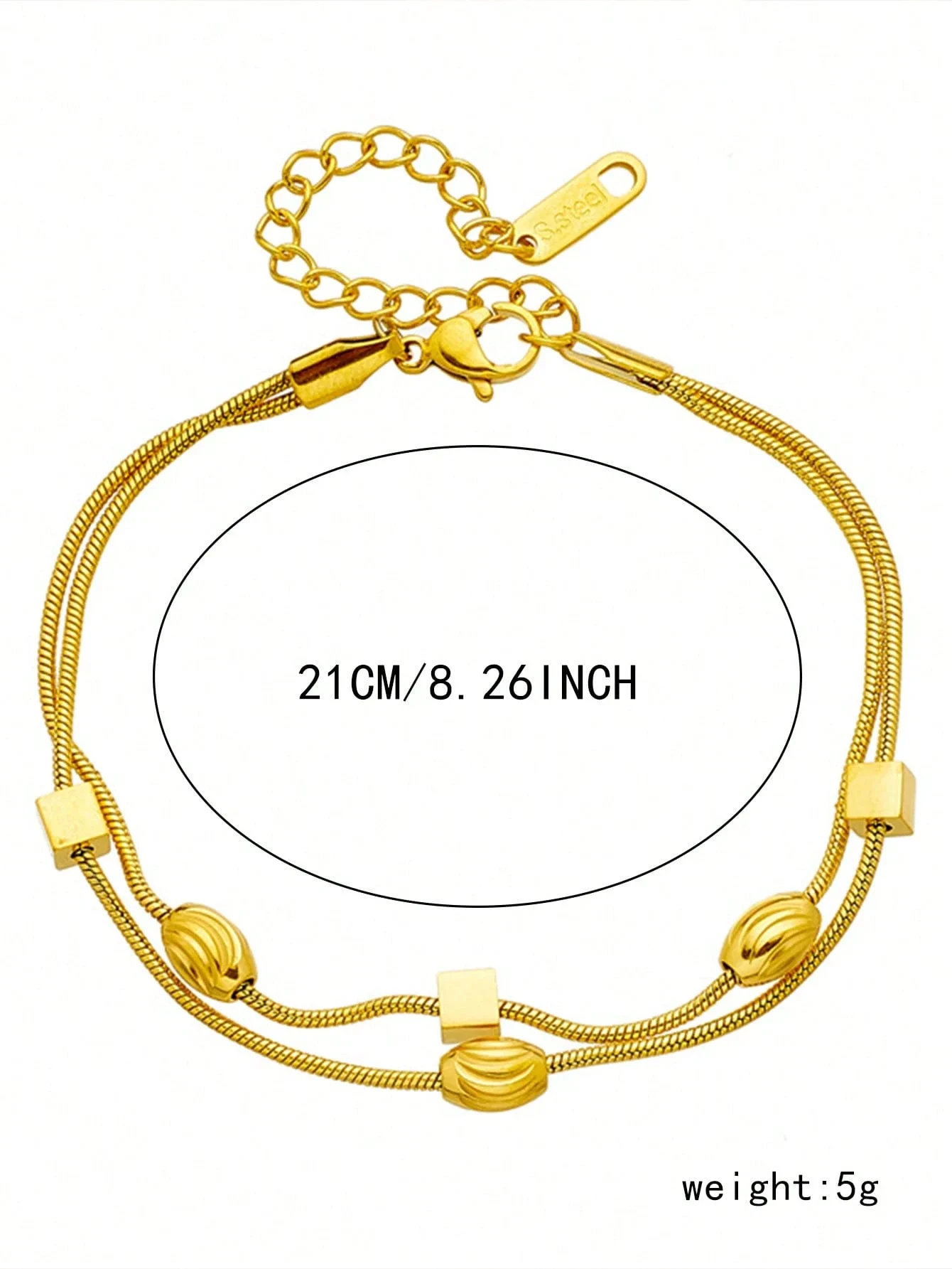 Ta wyjątkowa bransoletka ze stali szlachetnej w kolorze złotym to połączenie nowoczesnego minimalizmu z designerskim charakterem. Geometryczne elementy i podwójna konstrukcja łańcuszka sprawiają, że jest to must-have dla kobiet ceniących oryginalną biżuterię na co dzień.