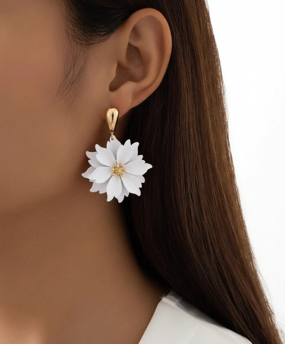 Wyraziste kolczyki w kolorze bieli z efektownymi trójwymiarowymi kwiatami to must-have dla miłośniczek odważnej biżuterii. Wykonane ze stali szlachetnej ze złotym biglem, gwarantują komfort noszenia i trwałość koloru. Przekonaj się, dlaczego te kolczyki zdobywają serca!