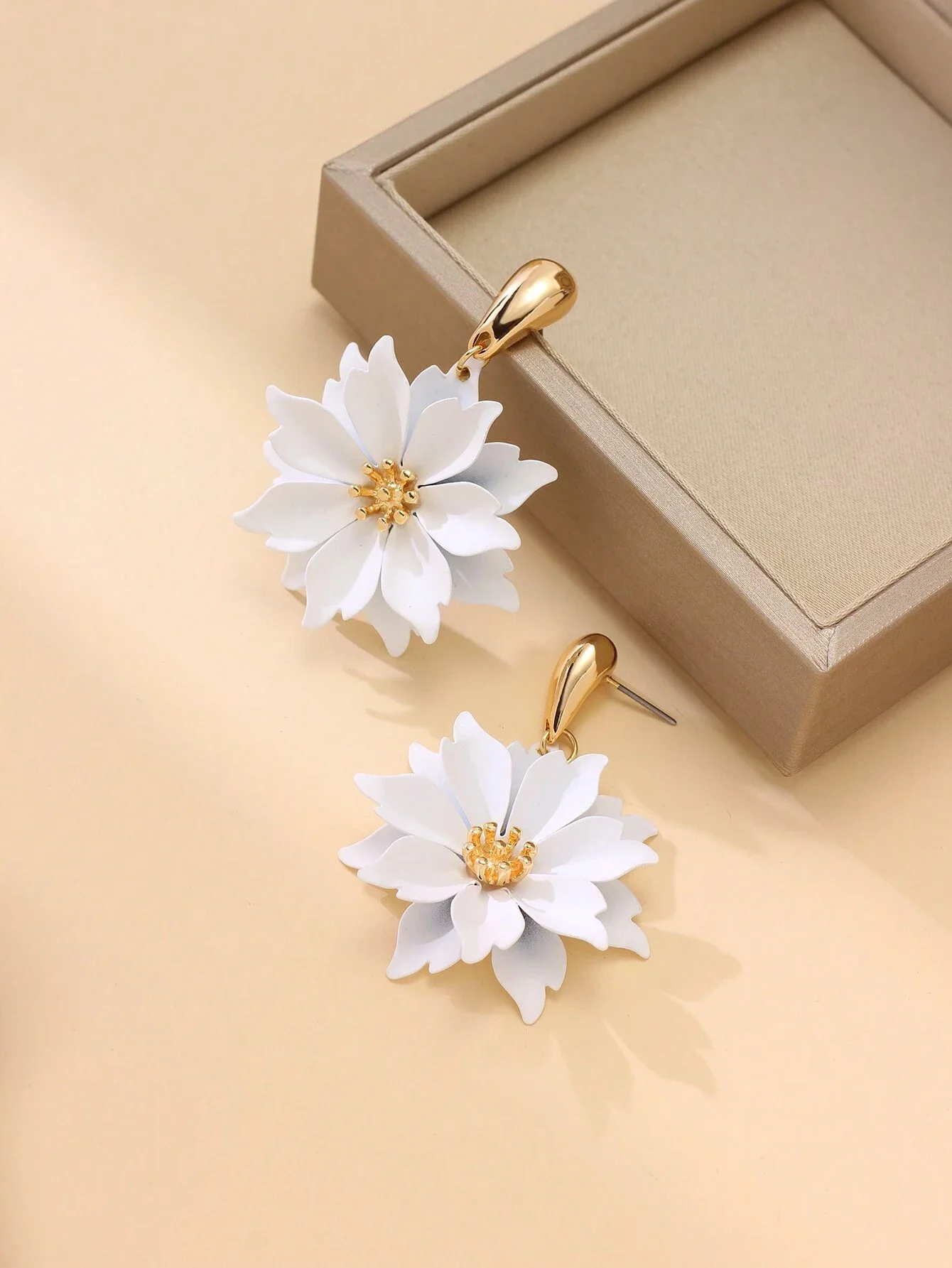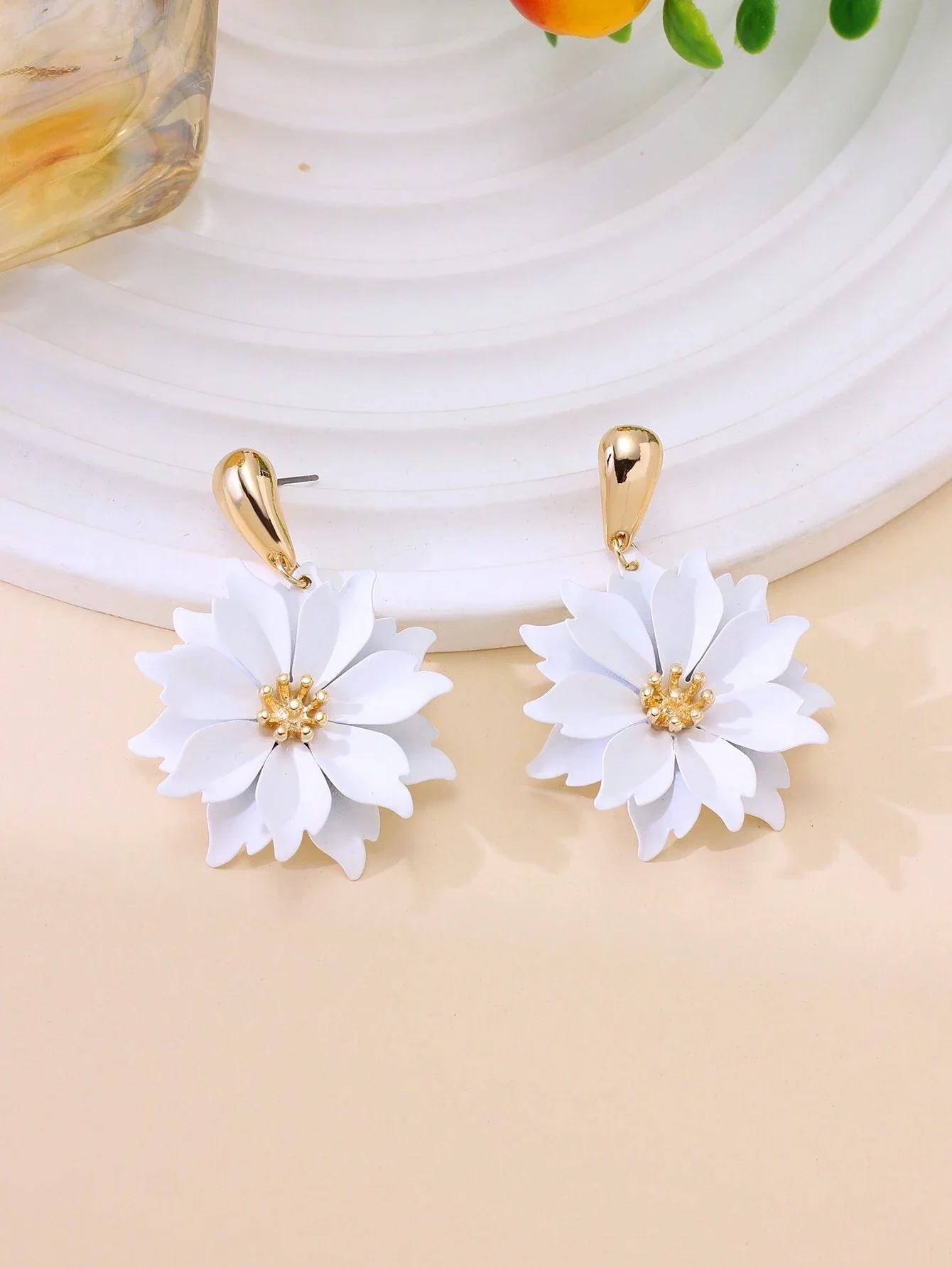 Długość kolczyków: 5,2 cm | Szerokość kwiatka: 3,7 cm | Materiał: stal szlachetna | Kolor: biały, złoty | Zapięcie: bigiel sztyftkowy
