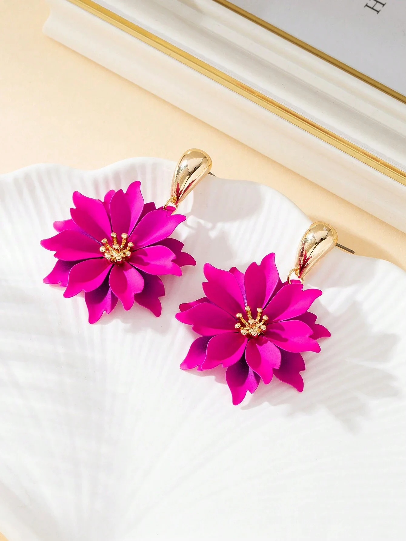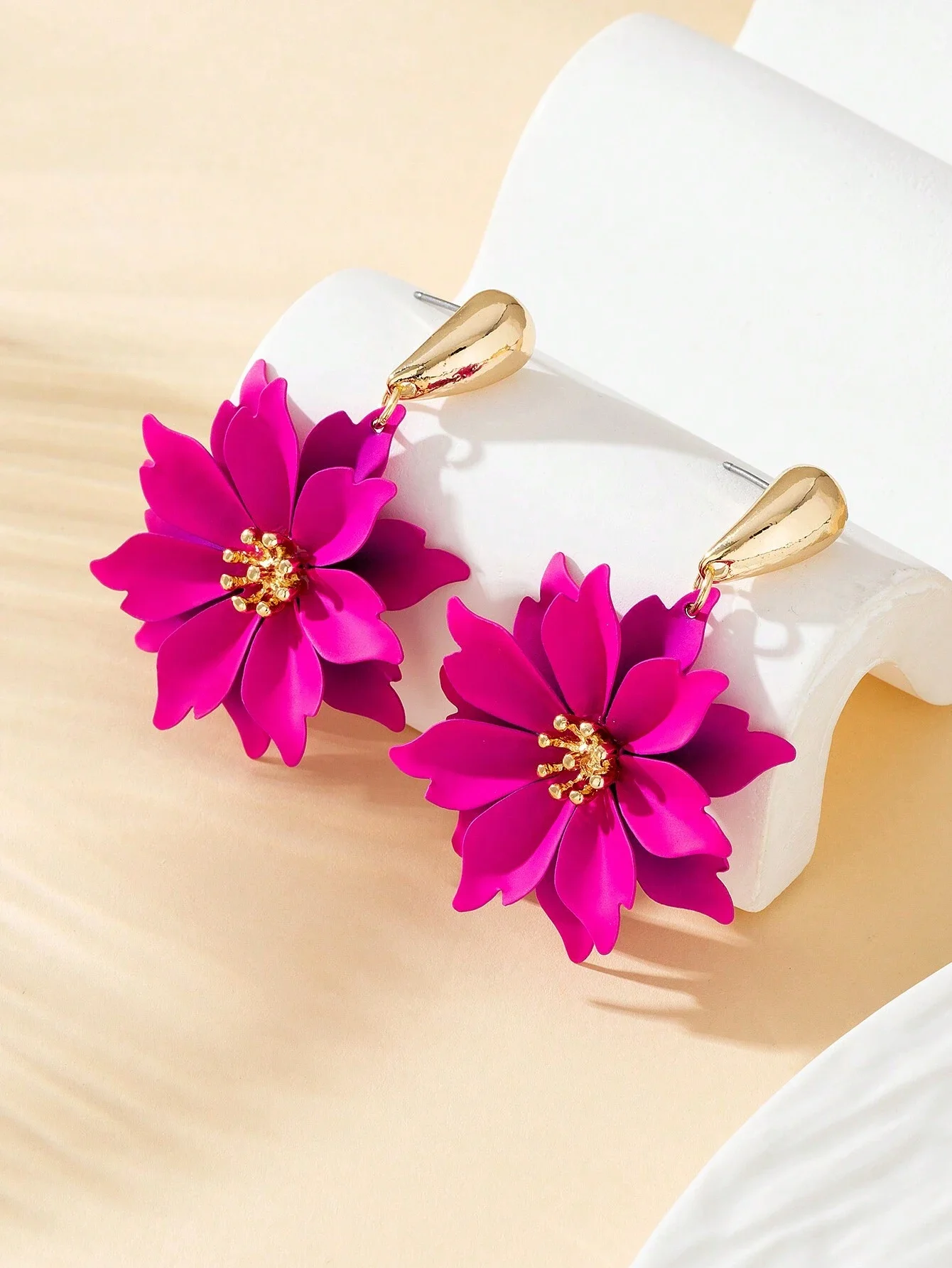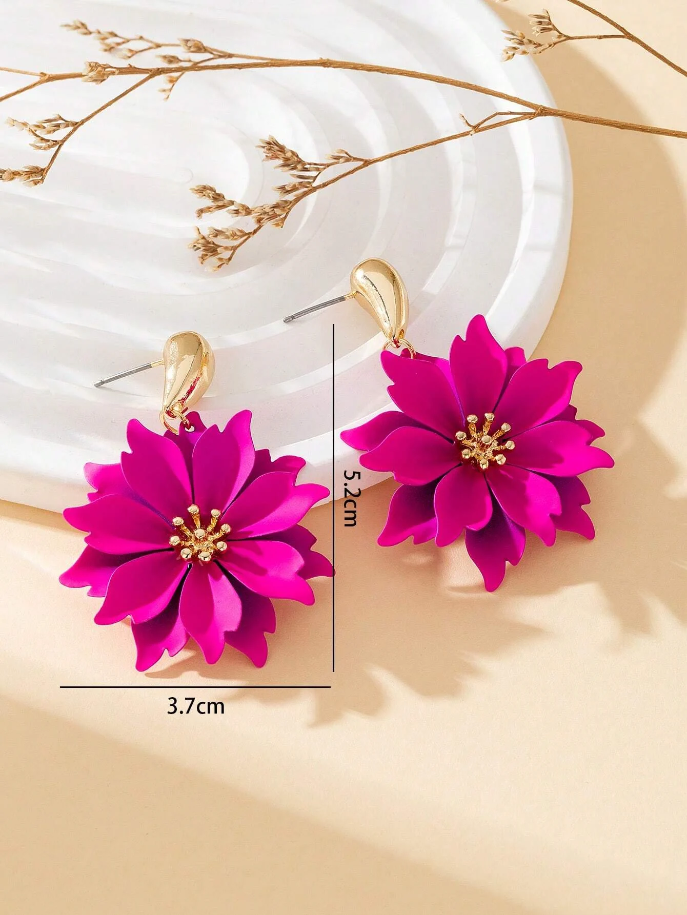 Długość kolczyków: 5,2 cm | Szerokość kwiatka: 3,7 cm | Materiał: stal szlachetna | Kolor: fuksja, złoty | Zapięcie: bigiel sztyftkowy