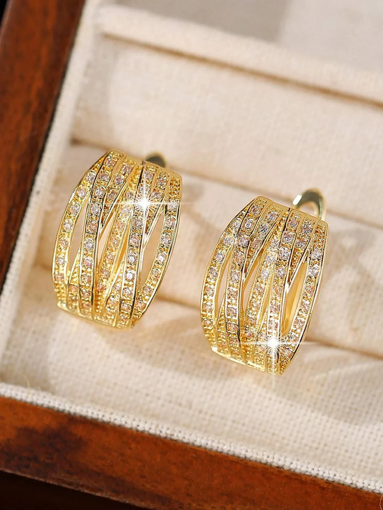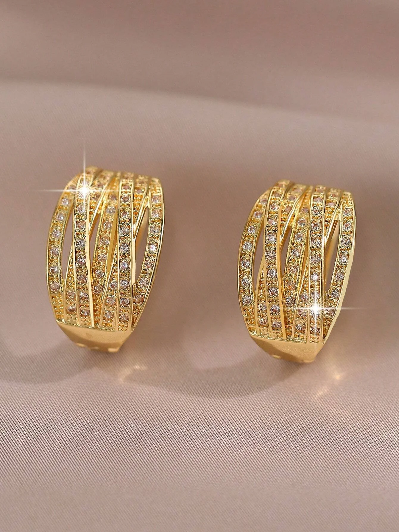 Wymiary: 1,9 cm x 1,3 cm | Materiał: stal szlachetna | Kolor: złoty | Kamienie: białe cyrkonie sześcienne | Zapięcie: angielskie