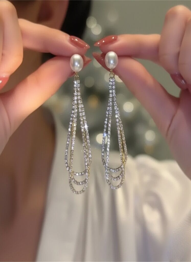 Podkreśl swoją wyjątkowość z naszymi zjawiskowymi kolczykami, które łączą w sobie elegancję i najnowsze trendy. Stworzone z myślą o kobietach ceniących sobie wyrafinowany styl, te długie kolczyki z perłami i kryształkami w kształcie kropli wody z frędzlami, perłami i kryształkami górskimi staną się centralnym punktem Twojej stylizacji. Idealnie pasują do wieczorowych kreacji, dodając im niepowtarzalnego charakteru.