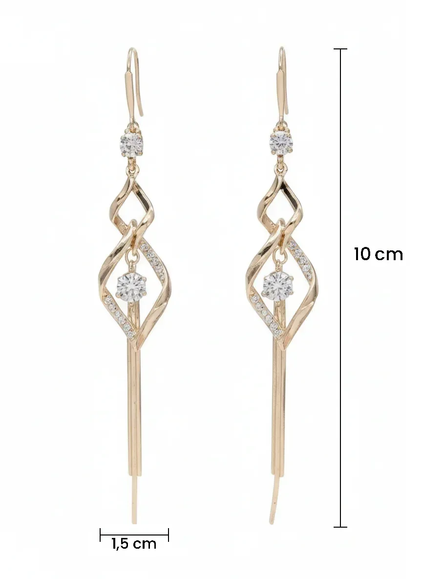 Te zjawiskowe kolczyki ze stali szlachetnej w kolorze srebrnym to kwintesencja eleganckiego glamour i wyrafinowanego stylu. Model z geometrycznym, skręcanym wzorem ozdobiony lśniącymi cyrkoniami i długimi łańcuszkami tworzy efektowną kompozycję, która przyciąga wzrok i dodaje kobiecego uroku każdej stylizacji.