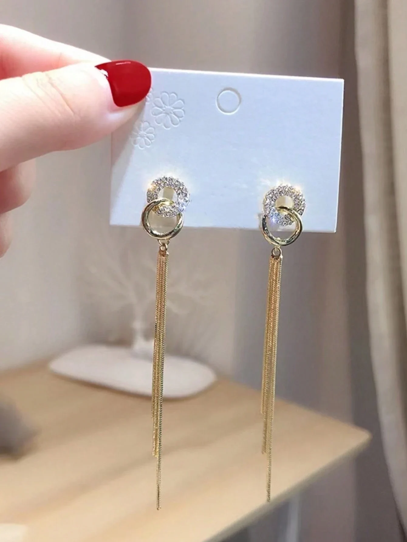 Luksusowe długie kolczyki ze stali szlachetnej w kolorze złotym z podwójnymi kółkami ozdobionymi cyrkoniami i wiszącymi łańcuszkami. Hipoalergiczne, trwałe i ponadczasowe – idealne na wieczorne wyjścia i specjalne okazje. Zobacz pełny opis i odkryj wszystkie zalety tej wyjątkowej biżuterii!