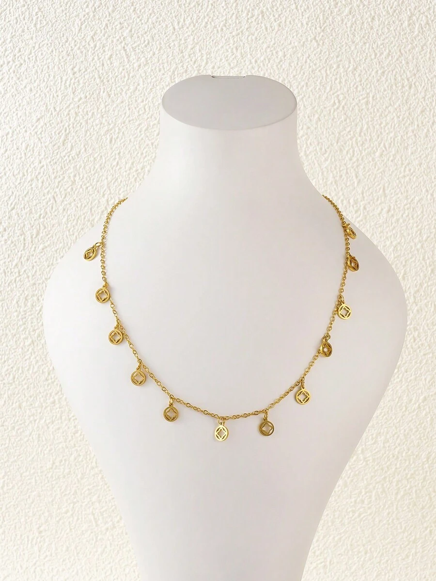 Modny naszyjnik ze stali nierdzewnej w kolorze złotym, ozdobiony zawieszkami. Regulowana długość 40-45cm. Idealny na co dzień i na prezent.