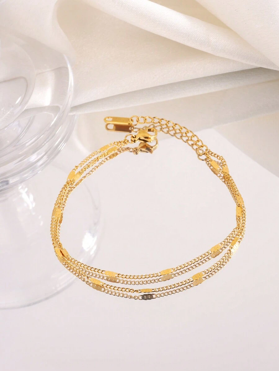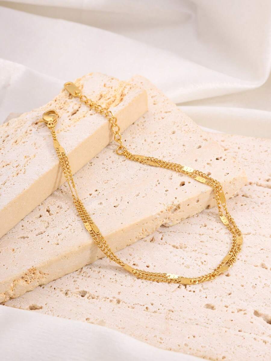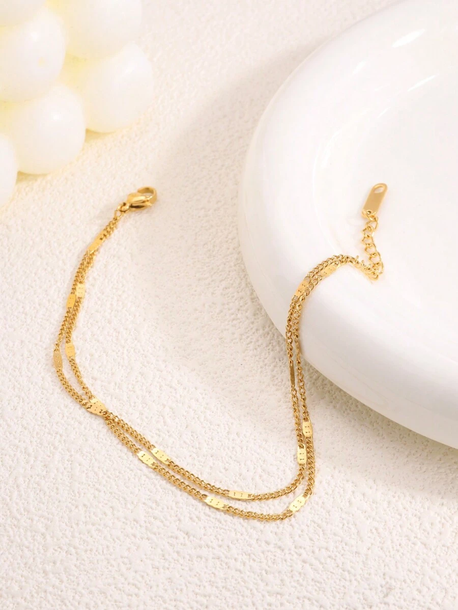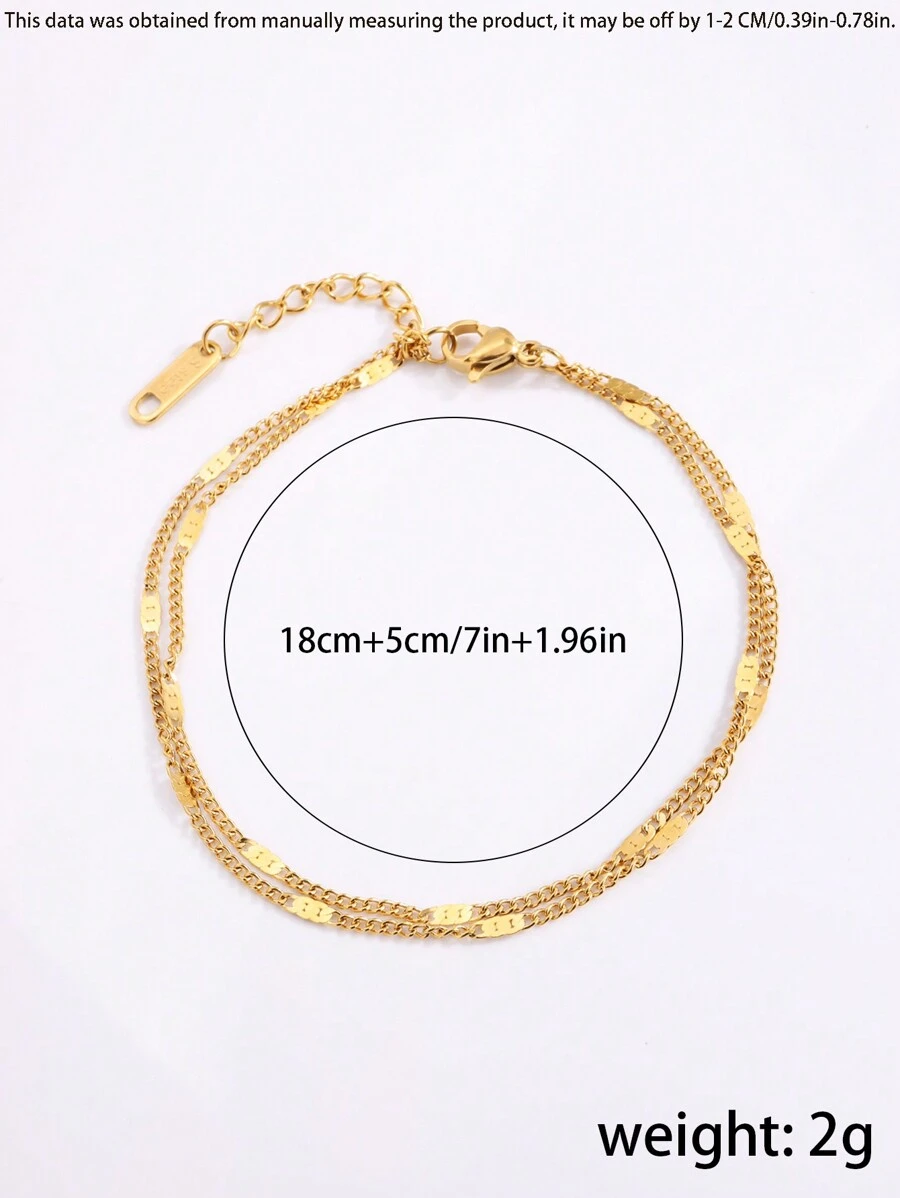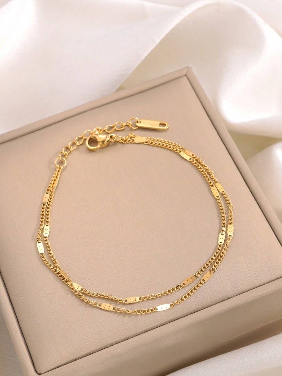 Stylowa bransoletka z podwójnym łańcuszkiem w kolorze złotym. Regulowana długość (18-23 cm) zapewnia idealne dopasowanie. Wygodne zapięcie na karabińczyk. Idealna na co dzień i na specjalne okazje. Hipoalergiczna i trwała.