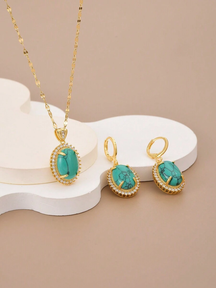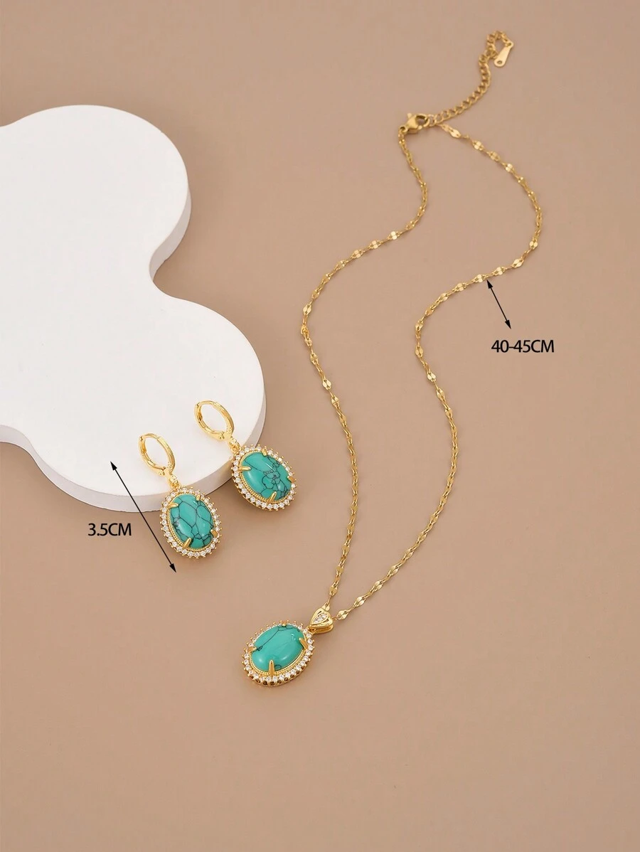 Elegancki zestaw biżuterii z imitacją turkusu: para kolczyków (3,5 cm) oraz regulowany naszyjnik (40-45 cm). Trwałość, szybka wysyłka, atrakcyjna cena, biżuteria na lata!