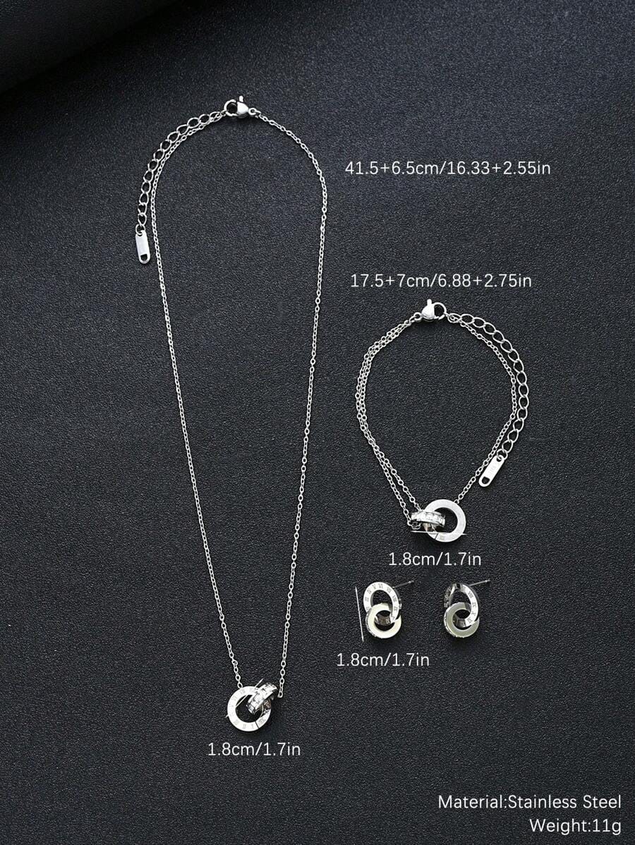 Zestaw Kolczyki Naszyjnik Bransoletka srebrny kolor ze stali szlachetnej nierdzewnej, z zapięciem na karabińczyk. Średnica kolczyków i zawieszki 1,8 cm, Regulowane długości: bransoletki (od 17,5 do 24,5 cm) i naszyjnika (od 41,5 do 48 cm). Waga zestawu około 11 g. Idealne dla miłośników mody i biżuterii!
