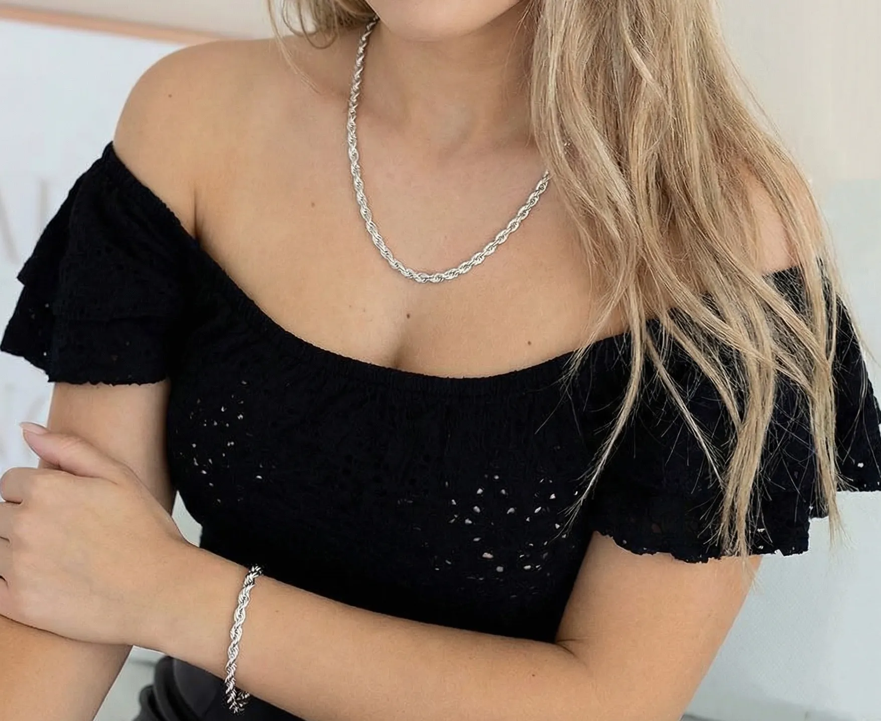 W skład tego stylowego duetu wchodzi klasyczny łańcuszek o idealnej długości oraz pasująca do niego bransoletka na rękę. Dzięki temu stworzysz spójną stylizację w kilka sekund.